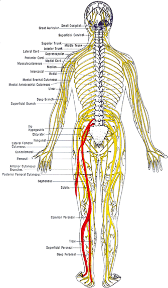 In our case for the sciatic nerve, you will see these symptoms occurring as high in the hip or glute/butt muscles and down all the way into the toes.